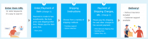Find an item → Place your order & pay for the item (Charge 1) → Item arrives at the warehouse → Choose shipping method & pay for shipping (Charge 2) → delivery